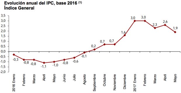 El Índice de Precios de Consumo (IPC) bajó un 0,1% en mayo respecto al mes anterior y recortó siete décimas su tasa interanual, hasta el 1,9%, su nivel más bajo desde diciembre del año pasado (1,6%), según el indicador adelantado del Instituto Nacional de Estadística (INE).