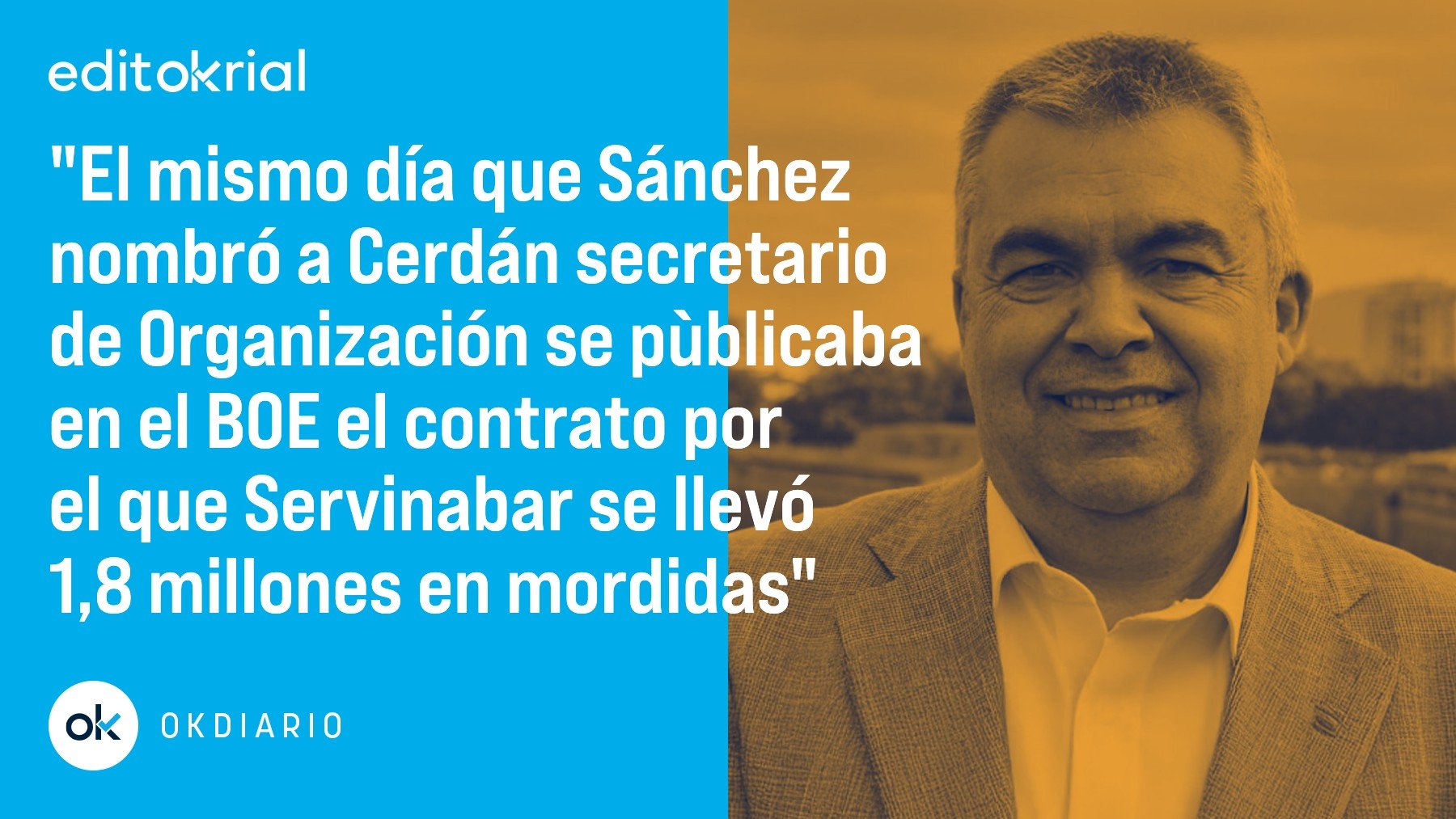 A Cerdán, propietario -entonces oculto- de Servinabar en un 45% le había tocado el gordo, aunque sólo prestara un trabajador para la obra. En total: 1,8 millones de euros para Servinabar, en virtud de los distintos acuerdos firmados con Acciona, en los que se determinaba que la empresa de Cerdán y Antxon Alonso cobraría el 2 por ciento neto sobre el importe percibido por Acciona. Y la guinda: Pedro Sánchez nombraba a Cerdán secretario de Organización. Es fácil saber lo que Cerdán le dijo a su esposa: «Paqui, este día no lo olvidaremos jamás»