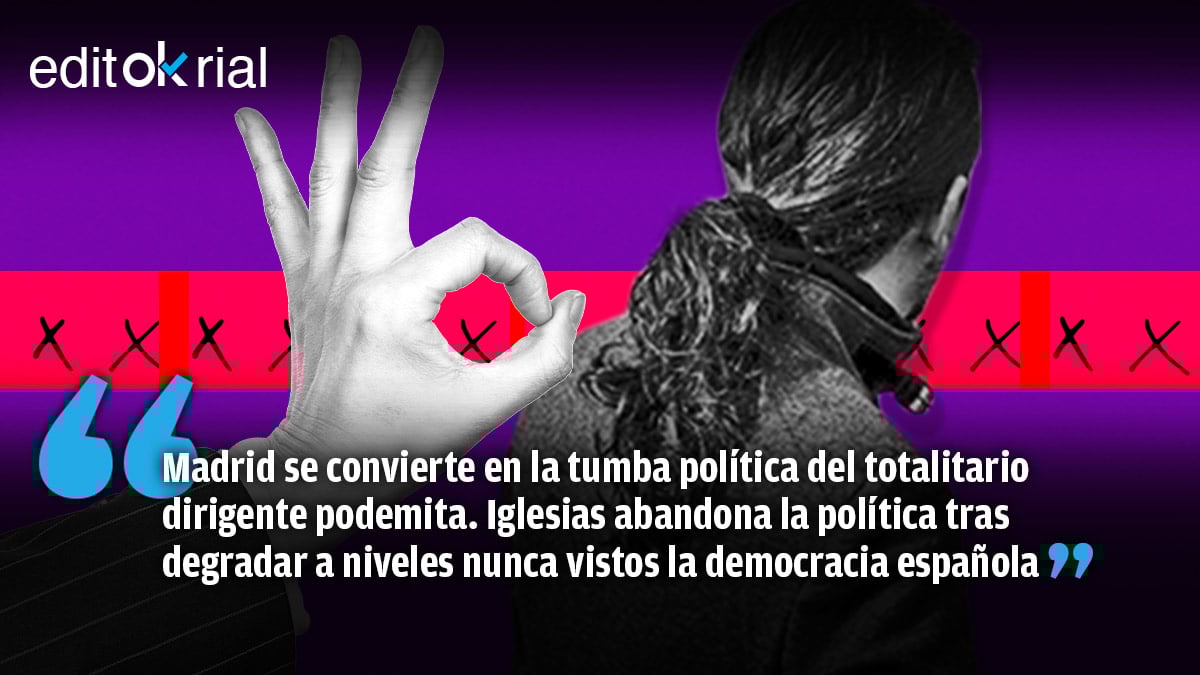 La retirada de Iglesias es consecuencia de las sucesivas bofetadas que los electores le han venido propinando elección tras elección. Madrid ha sido su tumba política, pero el líder podemita ya venía noqueado. Hasta al anunciar su retirada le ha faltado categoría. Su despedida es la propia de un totalitario sin escrúpulos que, en lugar de hacer autocrítica, carga contra el electorado. Su paso por la política española no se ha traducido -como presume- en nada bueno para la democracia española. Todo lo contrario: si la libertad se ha visto amenazada ha sido precisamente porque su concepto de la democracia es incompatible con un Estado de Derecho con separación de poderes. Su retroalimentación de intereses con golpistas y proetarras entregó el poder político a los enemigos de España, en connivencia con un presidente del Gobierno que, con tal de mantenerse en el poder, permitió sin inmutarse que la democracia se fuera degradando a pasos agigantados. Que se vaya Iglesias es la mejor noticia, pero conviene no olvidar que su partido sigue en el Gobierno de España. Iglesias se va, pero el problema es que Pedro Sánchez sigue en La Moncloa gracias el apoyo del populismo de ultraizquierda. Madrid le ha dado a Iglesias la puntilla política porque, al fin y al cabo, nadie como él encarna los valores contrarios a la libertad. Madrid no paga totalitarios. Que se vaya. Y cuanto más lejos, mejor.