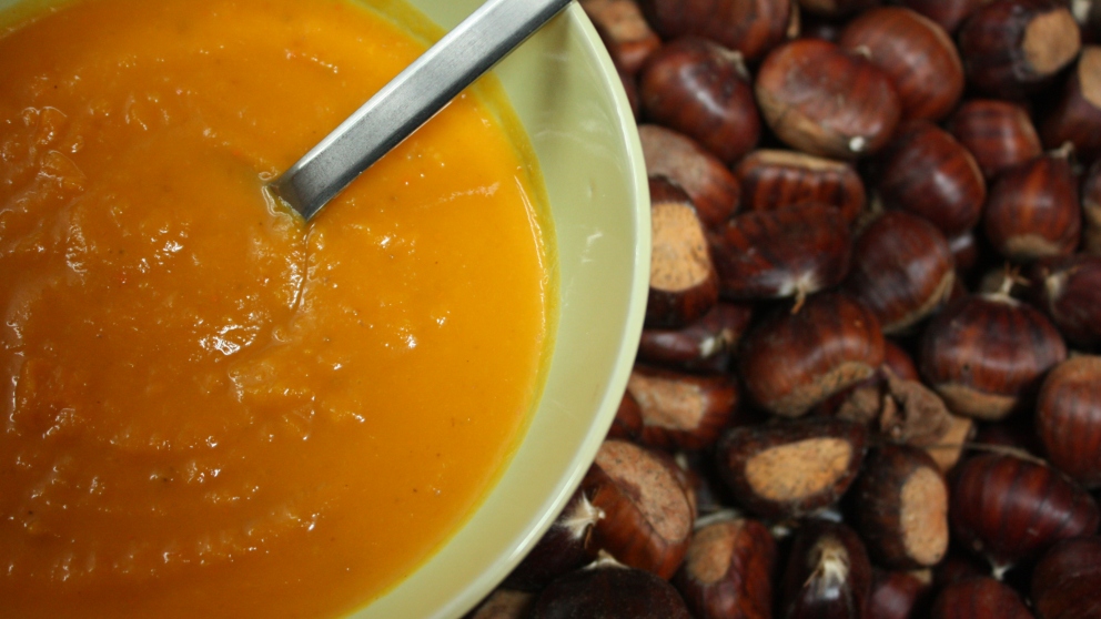 Esta receta muy otoñal, la crema de calabaza y castañas, es estupenda para aprovechar los productos de temporada. Puede servirse como entrada en la cena navideña, pues gusta tanto a niños como a adultos. Las castañas se consumen asadas, hervidas, al horno o confitadas, son protagonistas de innumerables platos dulces como salados. Además, este saludable ingrediente tiene muchos nutrientes. Aportan fibra y carbohidratos complejos, y por ello se pueden incluir en dietas para adelgazar, siempre y cuando se consuman con moderación.