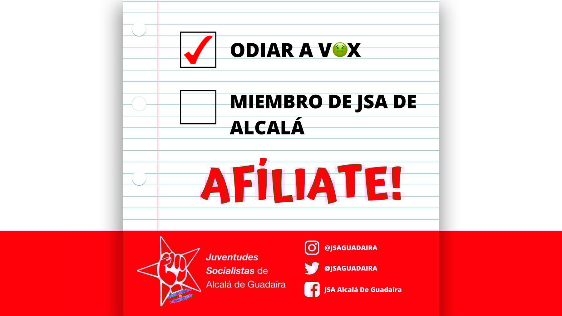 Juventudes Socialistas de Andalucía (JSA), los cachorros del PSOE de Andalucía (PSOE-A), están pidiendo a sus afiliados, en primer lugar, «odiar a Vox», y en segundo, afiliarse a las JSA. Este es el discurso de odio socialista que está intentando impregnar en Alcalá de Guadaíra, municipio sevillano que ya controla el PSOE. «¡¡Es tu momento!! Si eres joven, tienes interés por la política y te consideras orgullosamente de izquierdas… Te estamos buscando. No te lo pienses y contacta con nosotros», han señalado desde JSA Alcalá de Guadaíra a través de sus redes sociales.