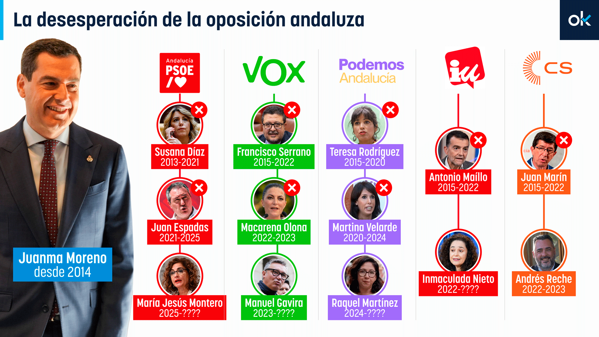 Pero es que si la izquierda lo ha intentado con ocho políticos, la derecha y el centro ha hecho lo propio con cinco. En Vox Andalucía comenzaron intentándolo con Francisco Serrano desde 2015 hasta 2022, momento en el que Macarena Olona cogió su testigo para las elecciones autonómicas de aquel año. Tras su abrupta salida, Manuel Gavira la sustituyó como líder del partido en la comunidad. En Cs, por su parte, dos han sido las personas encargadas de liderar al partido -ya extinto en la comunidad- desde que Juanma Moreno es presidente del PP-A: Juan Marín (2015-2022), quien, eso sí, fue clave para echar al socialismo de San Telmo, y Andrés Reche (2022-2023).