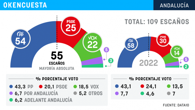 El Partido Popular de Juan Manuel Moreno Bonilla volverá a ganar las elecciones autonómicas en Andalucía el próximo domingo 17 de mayo, pero no logrará reeditar su mayoría absoluta y necesitará a Vox para gobernar. Es el principal cuadro de la OKEncuesta flash que Data10 ha realizado para OKDIARIO tras la convocatoria electoral anunciada este lunes por el dirigente popular, que también pinta un electorado más escorado que nunca hacia la derecha en Andalucía. Entre el PP y Vox sumarían 78 escaños y el 61,8% del total del voto, un hito histórico en una comunidad que sólo había conocido presidentes socialistas hasta la investidura de Moreno Bonilla en 2019.
