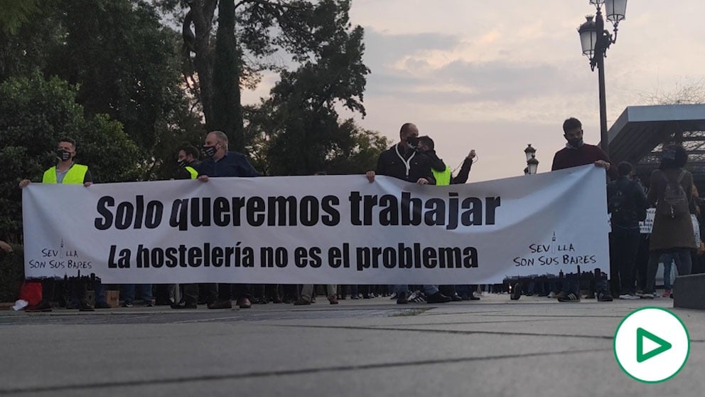 Los dueños de bares y restaurantes de Andalucía, que dicen facturar apenas un 20% de lo normal, no pueden más. Por ello, este viernes han recorrido Sevilla gritando distintas proclamas en las que reivindican su derecho a trabajar. Dando comienzo a las 19:00 de la tarde en Puerta de Jerez, se han hecho notar por toda la Avenida de la Constitución hasta llegar a Plaza Nueva, lugar en el que se encontraba una comitiva de Vox apoyando la manifestación.