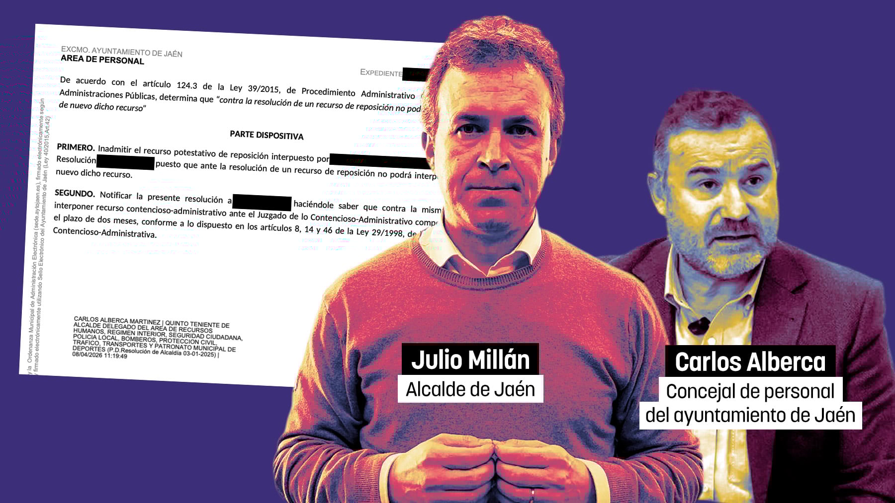 «Presenté un recurso de reposición contra la resolución de actualización de la bolsa de técnicos de gestión donde colocaban en primer lugar al asesor de Jaén Merece Más, incumpliendo el reglamento de funcionamiento de las bolsas del ayuntamiento, y me lo han inadmitido. Con esto ya he agotado la vía administrativa, por lo que paso a vía judicial».