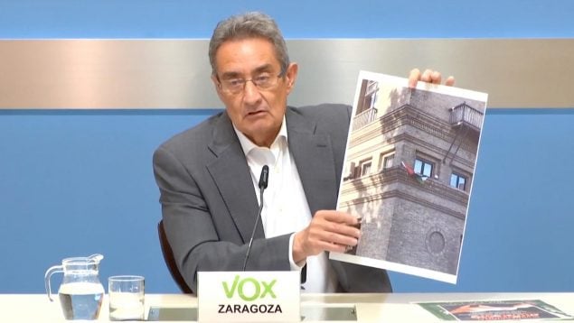 Este miércoles, Vox ha exigido la retirada inmediata de la bandera palestina colocada en la fachada del Ayuntamiento de Zaragoza. El portavoz municipal Julio Calvo ha señalado a Zaragoza en Común (ZeC) –los homólogos de Ada Colau– de ser los responsables. «Corresponde a la ventana de su despacho», ha señalado en rueda de prensa.