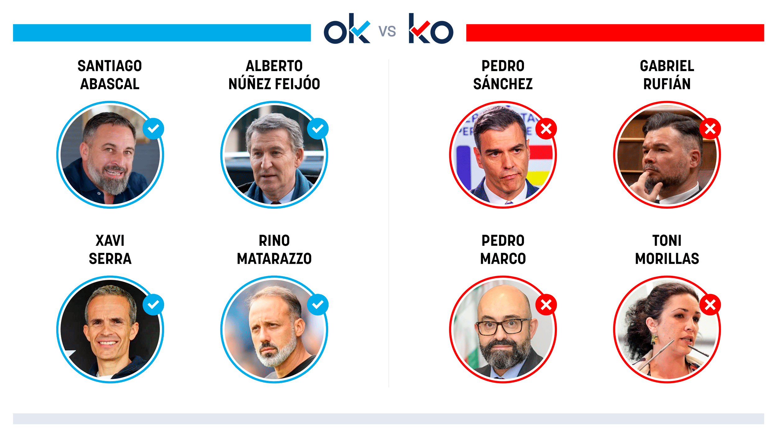 OK: Santiago AbascalPor su hábil respuesta a Sánchez al preguntarle por su sueldo: «Yo no cobro de los prostíbulos».OK: Alberto Núñez FeijóoPor señalar a Sánchez por la tragedia de...