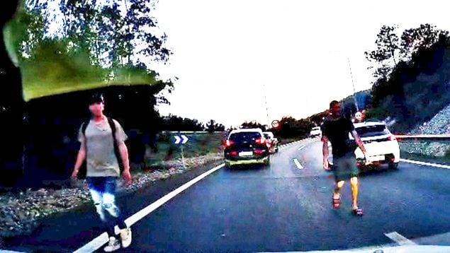 Uno de ellos, vestido únicamente con un pantalón corto, caminaba tambaleándose por el arcén con movimientos erráticos, mientras que el otro protagonizaba escenas aún más peligrosas: se adentraba directamente en el centro de la vía, cruzándose entre coches, camiones y motocicletas en plena hora punta. Todo ello a escasos centímetros de ser arrollado.