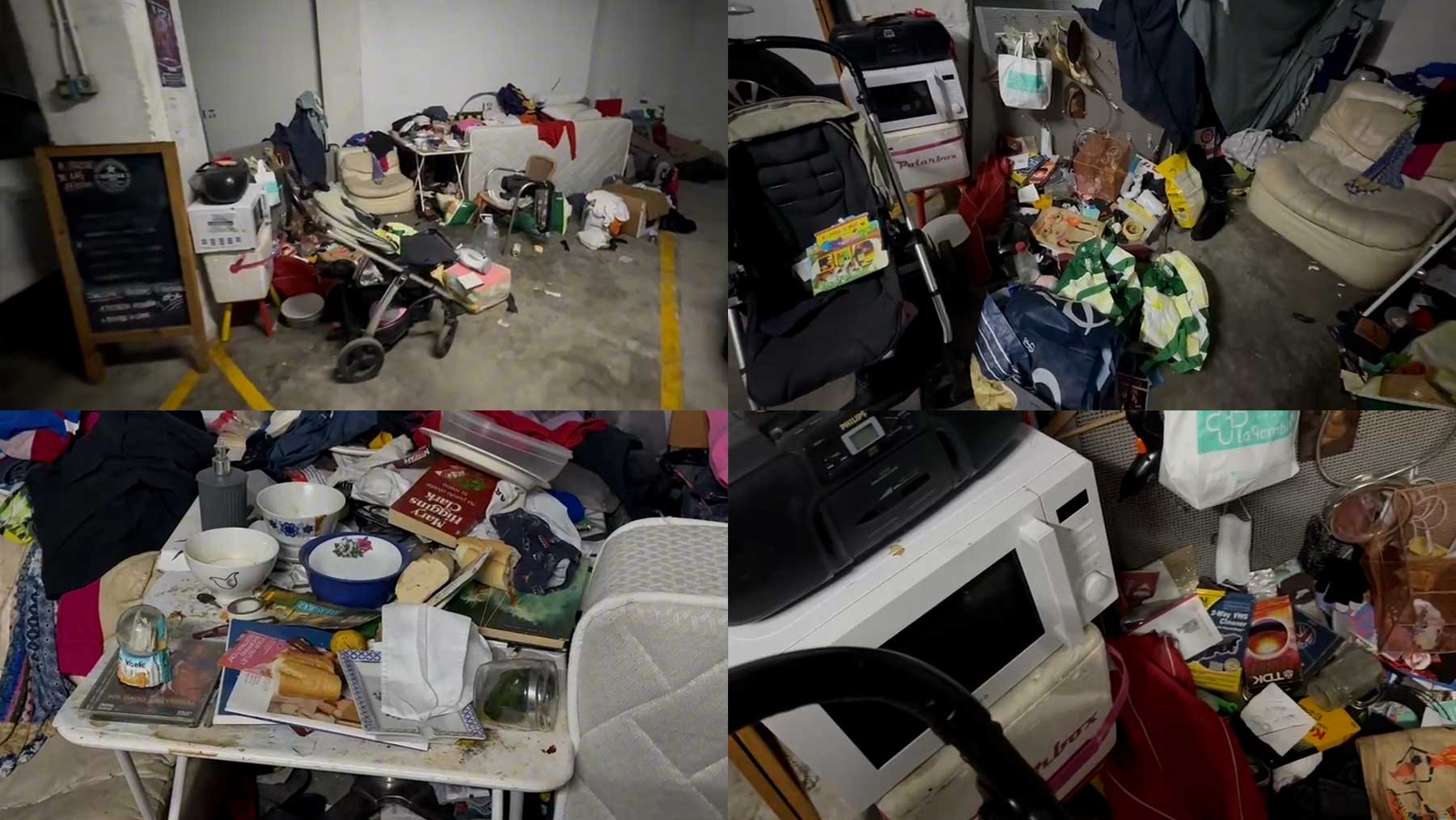 Hoy su plaza de aparcamiento es su dormitorio, su cocina y su refugio. Un colchón desgastado sobre el suelo, un microondas conectado como puede, una radio antigua que suena a deshoras, ropa amontonada, maletas abiertas, bolsas repletas, restos de comida. Basura acumulada en un espacio pensado para coches, no para personas.