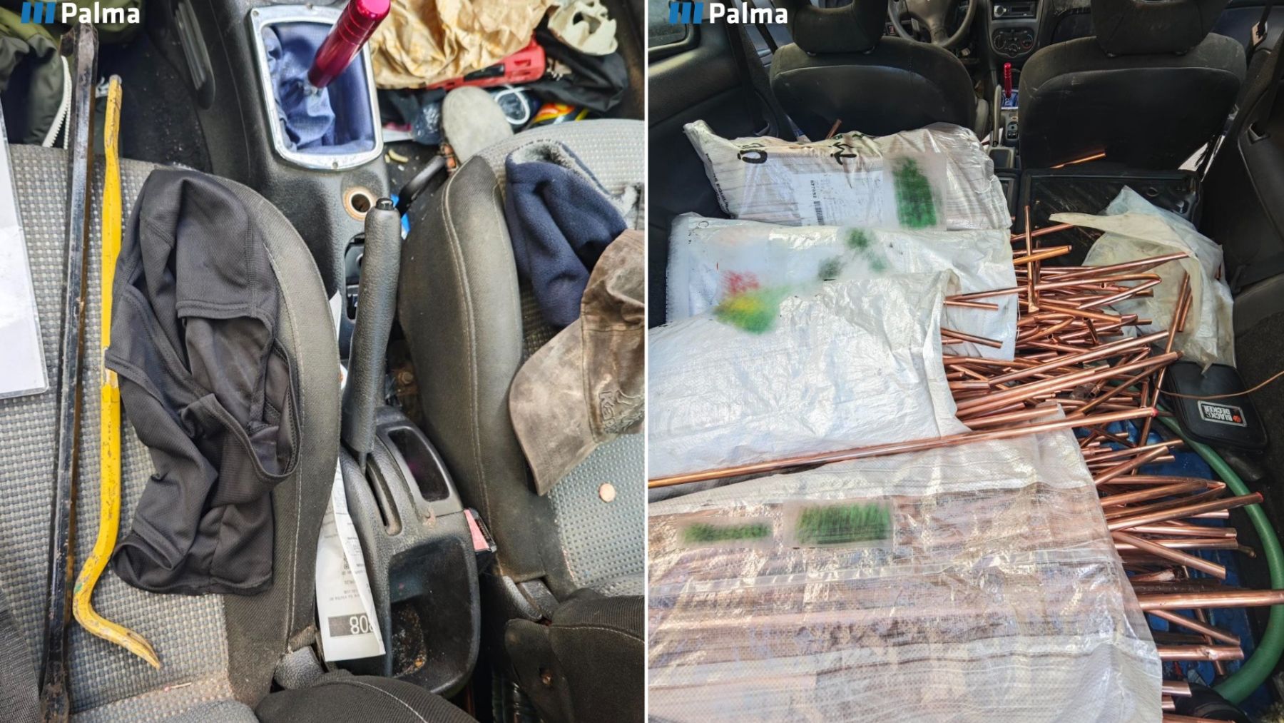 En el registro del turismo abandonado, los agentes hallaron una riñonera con el DNI del implicado y cuatro sacos cargados con gran cantidad de cobre, además de pasamontañas, patas de cabra y diversas herramientas. Las comprobaciones posteriores agravaron aún más la situación: el joven carecía de permiso de conducir y sobre él pesaba una orden de búsqueda y detención dictada por un juzgado de Palma por su presunta implicación en un accidente de tráfico ocurrido el pasado mes de noviembre, en el que falleció el conductor de una motocicleta.