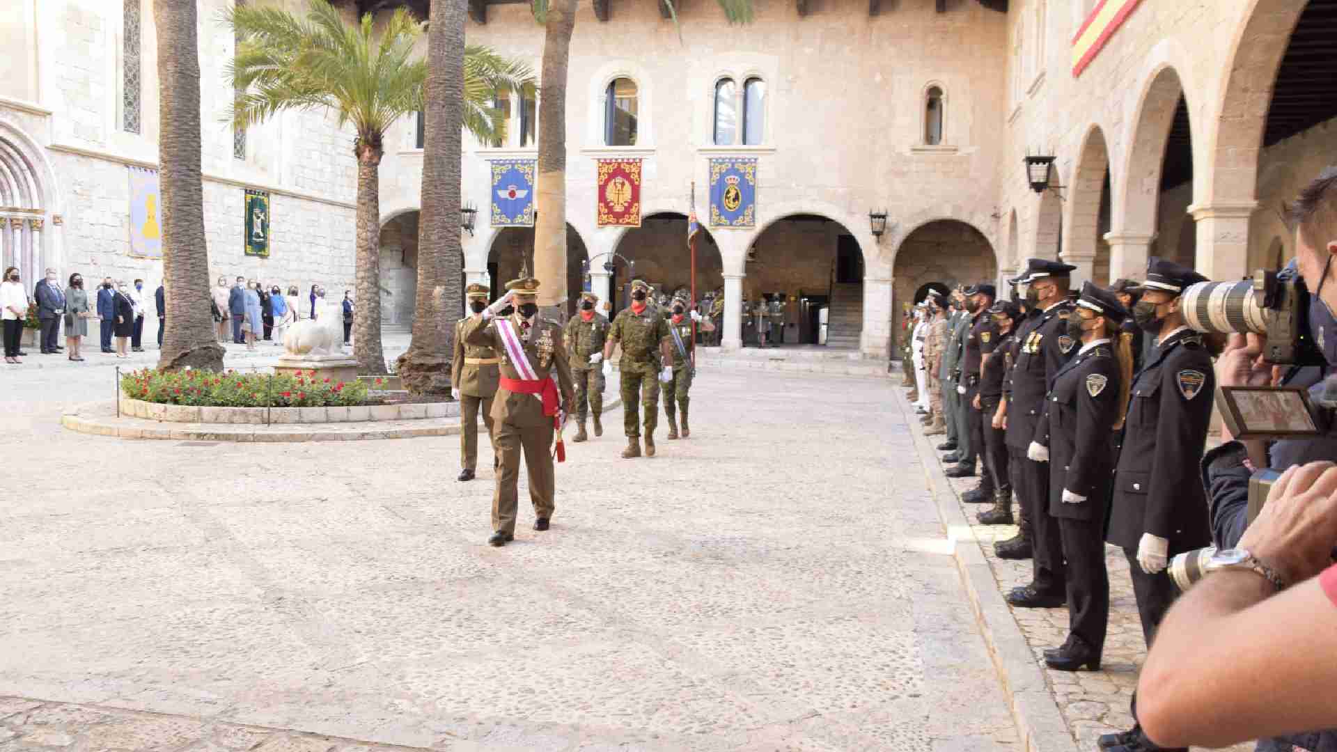 La Comandancia General de Baleares ha implantado la celebración del Día de la Fiesta Nacional con un solemne acto en el Palacio de la Almudaina que ha servido para «honrar a todos lo que trabajan para hacer frente a la tragedia vivida por la pandemia motivada por la Covid-19». Así lo ha manifestado el comandante general de las Islas, Fernando García Blázquez, quien ha clamado por la unión de toda la sociedad con las Fuerzas Armadas para afrontar tragedias como la pandemia, la erupción del volcán en La Palma o la de hace tres años con la inundación de Sant Llorenç.