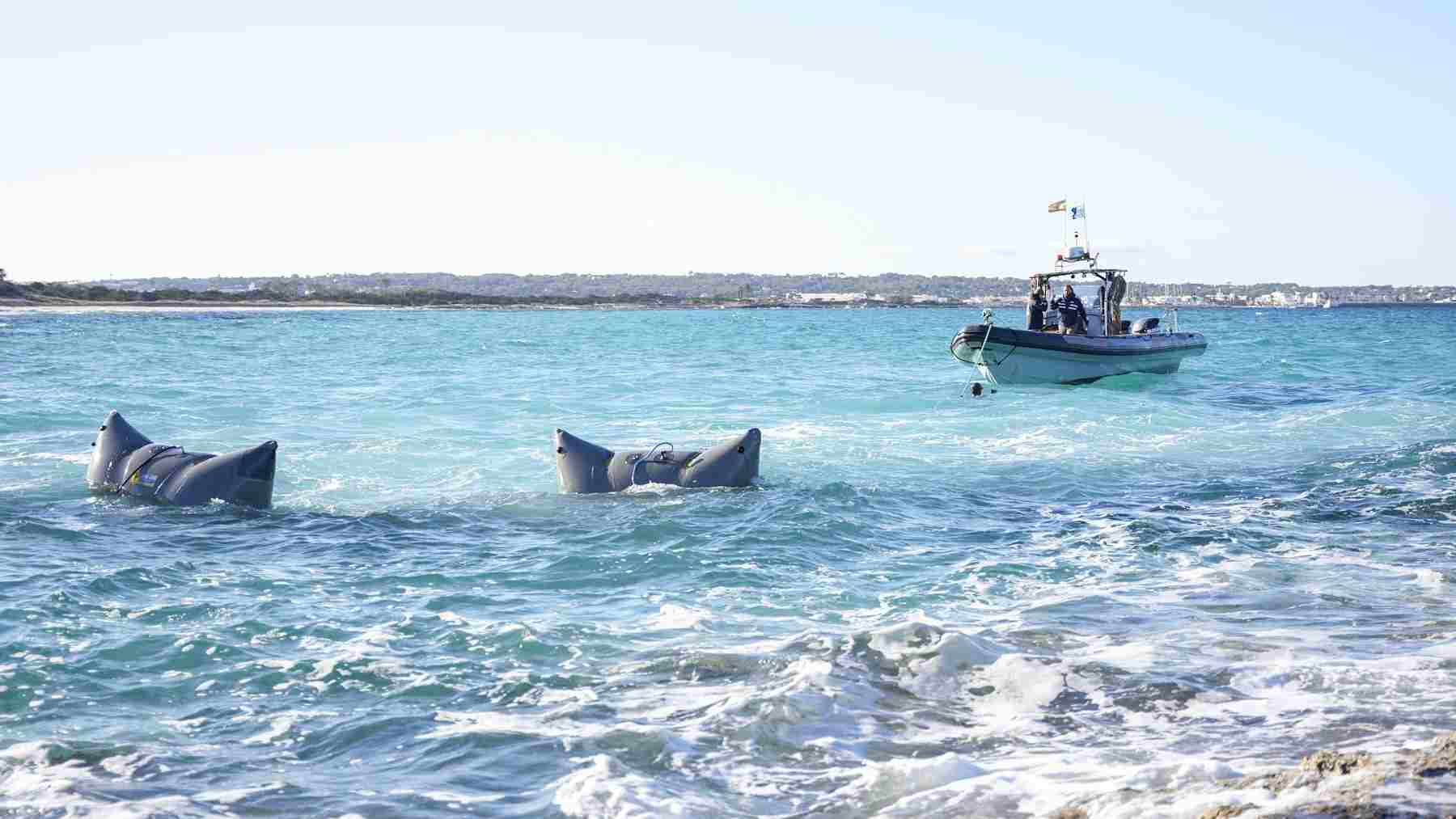 Un equipo de profesionales de una empresa contratada por el Consell de Formentera, está trabajando en el mar, con buzos especializados para retirar los restos a poco más de un metro de profundidad de las partes del casco como del motor.