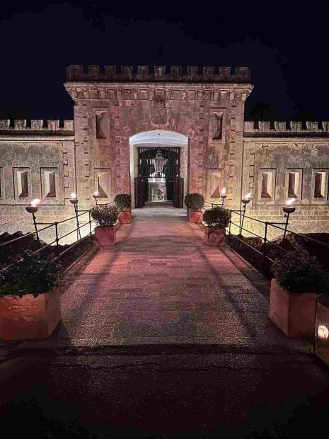 La decoración, firmada por Little Sister, envolvía todo el espacio en tonos otoñales: ocres, dorados suaves y verdes empolvados que parecían fundirse con la piedra de la fortaleza y el mar al fondo. Sobre las mesas, velas y flores silvestres componían un paisaje íntimo, sofisticado y cálido.