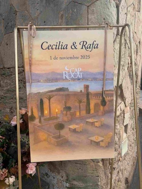 El escenario no podía ser otro que Cap Rocat, el hotel más emblemático de la isla, una fortaleza esculpida en piedra y mar que parece suspendida entre el cielo y la bahía de Palma. Bajo un sol amable de noviembre, los novios llegaron a las dos de la tarde entre aplausos, música y sonrisas. Cecilia, vestida de Cortana, irradiaba serenidad y estilo. El maquillaje y el peinado, obra de Soledad Rebollar -la estilista de artistas como Vanesa Martín o Malú, recientemente afincada en la isla-, realzaban su belleza natural con una elegancia discreta. Rafael, fiel a su personalidad, apostó por un blazer verde inglesa que reflejaba el equilibrio perfecto entre distinción y frescura.