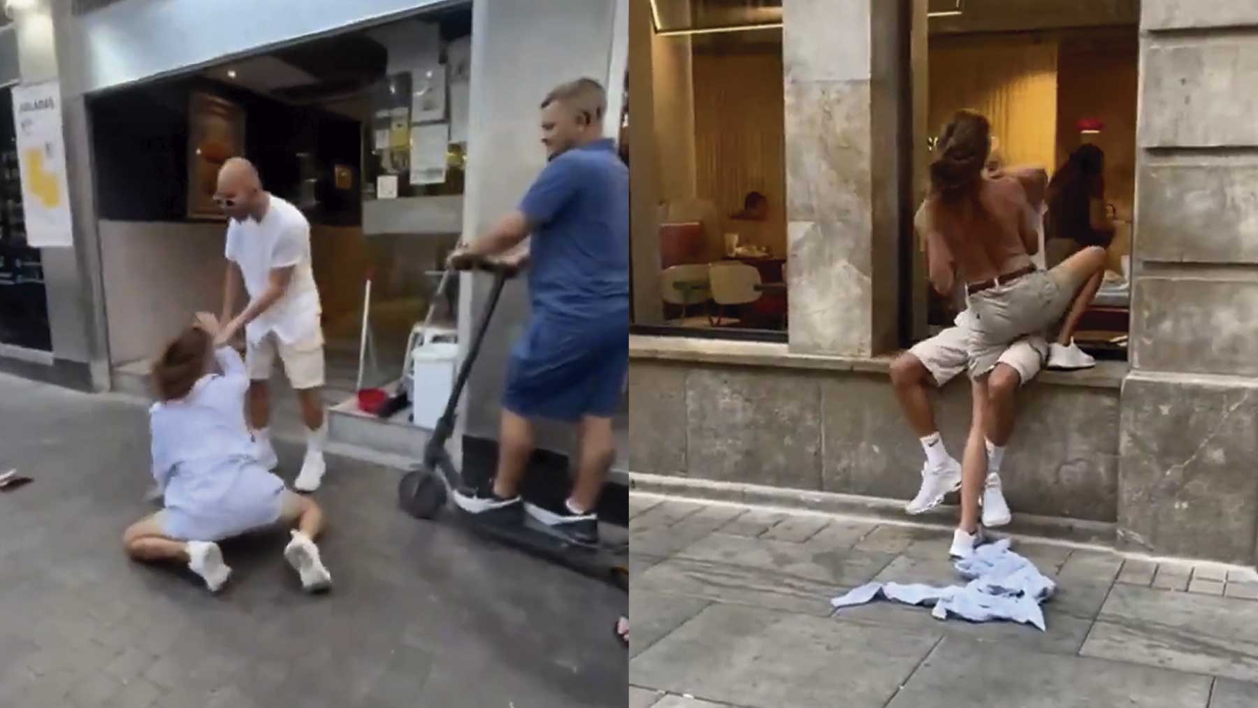 Al ver que la mujer no dejaba de molestarles, abordándoles con movimientos sexuales, los clientes acosados llamaron a la Policía Local. Numerosos curiosos se acercaron y grabaron las surrealistas escenas, jaleando a la mujer, que estaba fuera de sí.