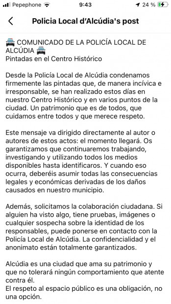 El texto finaliza con el cuerpo policial erigiéndose en portavoz de la ciudadanía: «Alcúdia es una ciudad que ama su patrimonio y que no tolerará ningún comportamiento que atente contra él. Él respeto al espacio público es una obligación, no una opción».