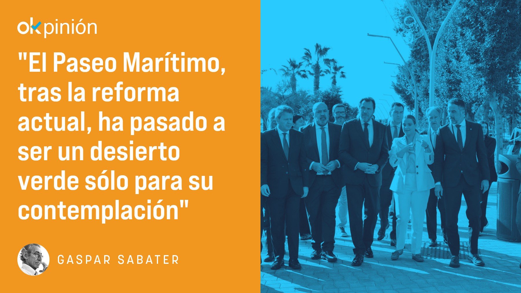 Disfrutar de la cercanía del mar frente a la bahía, con sus terrazas, sus bares, sus restaurantes e incluso sus lugares nocturnos de ocio, con un tráfico rodado calmado, debería ser un placer, pero el Paseo Marítimo, tras la reforma actual ha pasado a ser sólo un desierto verde, donde excepto ampliando espacios en las aceras y estrechando carriles de tráfico, el resto ha sido ocupado por costosas zonas verdes, sólo para su contemplación y muy costosas para su mantenimiento, pero inútiles para el disfrute de la mayoría.