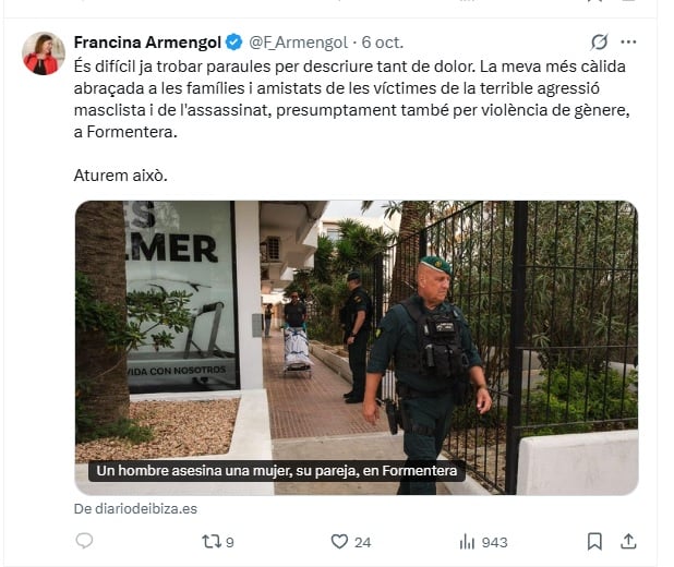 Armengol publicó en la mañana de este lunes en su perfil de la red social X: «Es difícil encontrar ya palabras para describir tanto dolor. Mi más cálido abrazo a las familias y amistades del asesinato, presumiblemente por violencia de género, en Formentera. Paremos esto».
