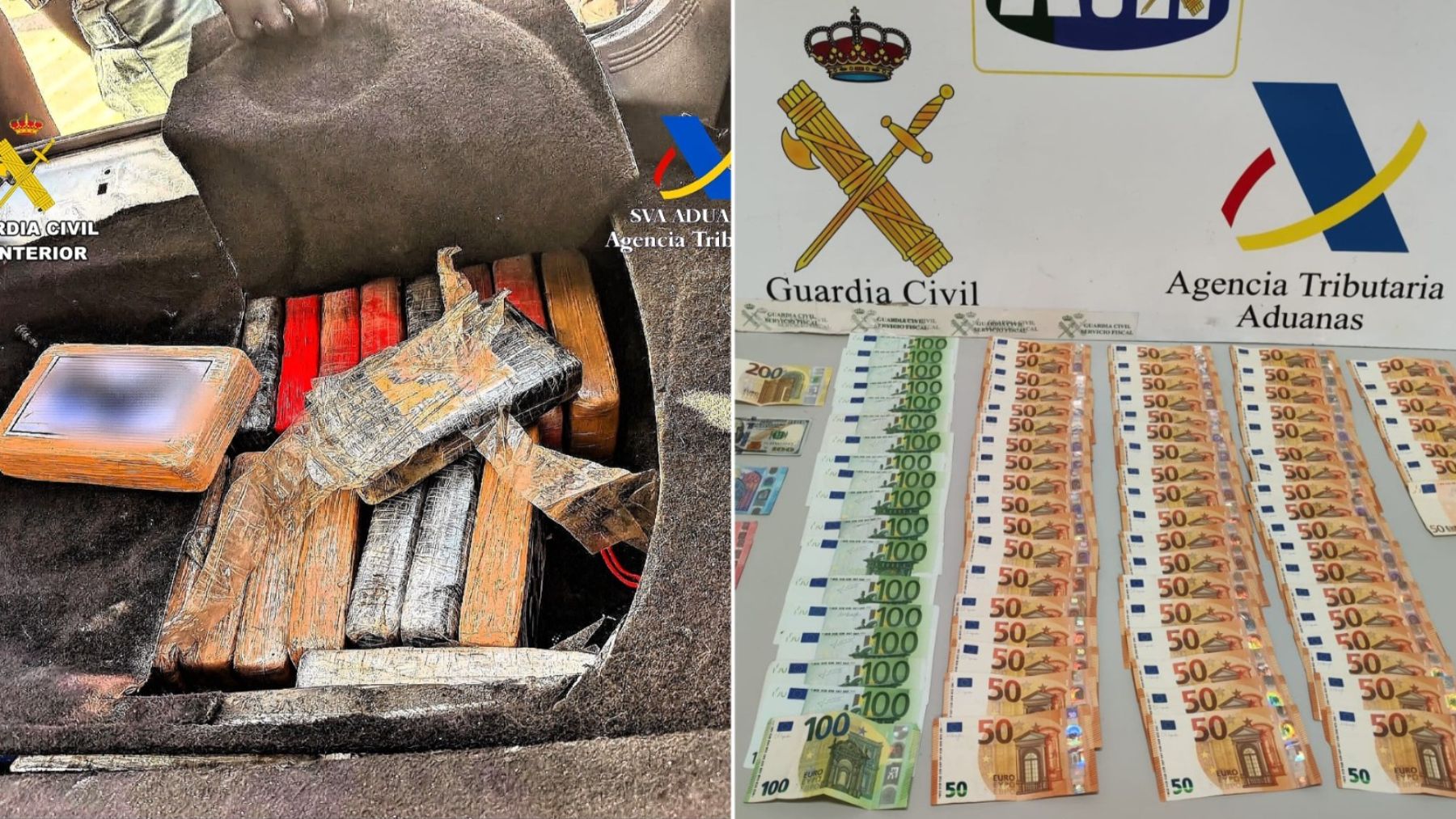 Tras un reconocimiento manual, los guardias civiles localizaron un doble fondo habilitado en el vehículo, donde se ocultaban 38 tabletas de cocaína con distintos logotipos. El peso total de la sustancia alcanzaba los 44 kilos. Además, se procedió a la intervención de 5.200 euros en efectivo.