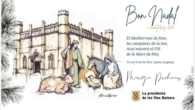 Asimismo, Prohens ha puesto en valor la imagen que acompaña la felicitación navideña. Se trata de una ilustración de Álex Ollers que muestra una representación del nacimiento frente a la Llotja de Palma. «Transforma el gran templo gótico en un belén que nos invita a pararnos un momento y mirar con ojos nuevos aquello que tenemos más cerca», ha asegurado