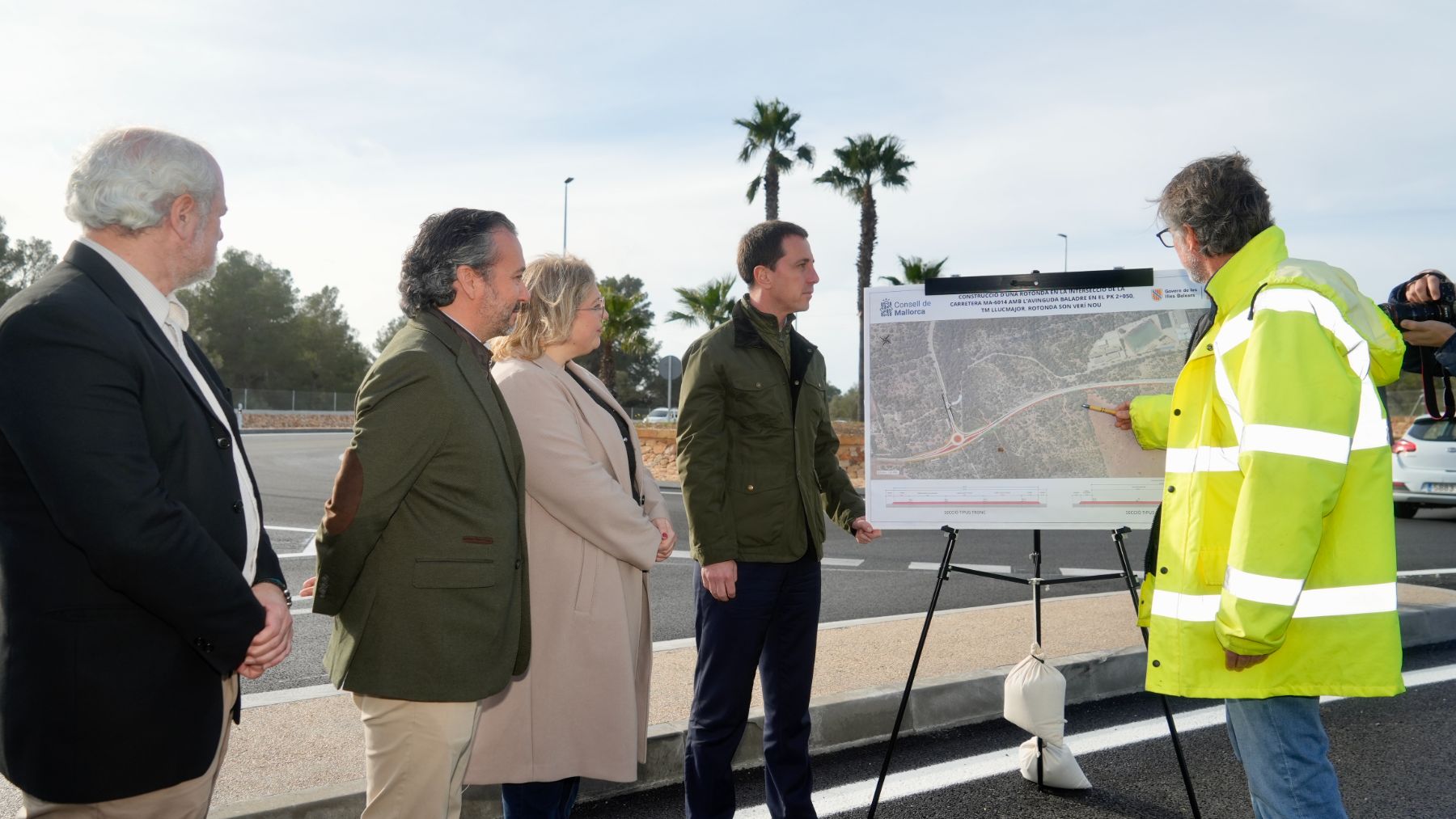 El presidente del Consell de Mallorca, Llorenç Galmés; el conseller de Territorio, Movilidad e Infraestructuras, Fernando Rubio, y la alcaldesa de Llucmajor, Francisca Lascolas, han inaugurado este martes la rotonda y el vial de Son Verí Nou dejando pasar por primera vez el tráfico e instalando una placa conmemorativa del acto.