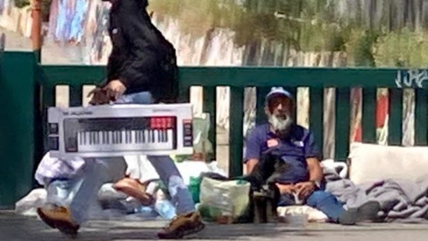 No hay declaraciones suyas porque no le gustó descubrir que estaba siendo fotografiado. Sin embargo no parece aislado de su entorno. Durante el día se le ve hablando con algún que otro vecino. Todo, después de cumplir con su obligación mañanera nada más despertarse: se levanta y saca a pasear al perrito que le acompaña para que pueda hacer sus necesidades. Nunca en la acera en la que vive.