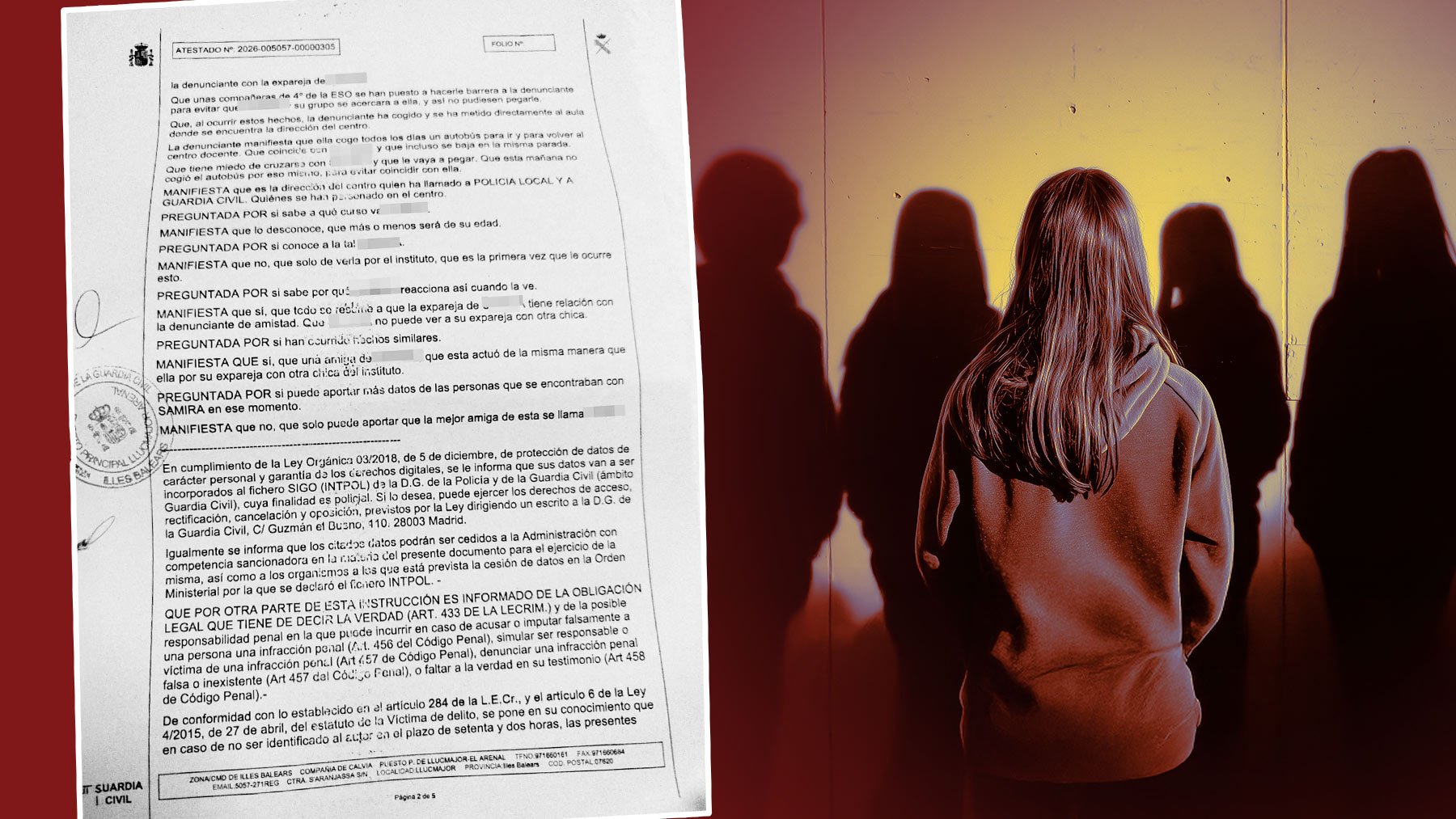 La menor de edad tiene tiene que hacer frente cada día a una rutina marcada por el miedo y la tensión constante. Según consta en la denuncia a la que ha tenido acceso OKBALEARES, la presunta acosadora persigue a la víctima por el colegio e incluso coge el mismo autobús y se baja en la misma parada para coincidir con ella y someterla a situaciones de acoso.