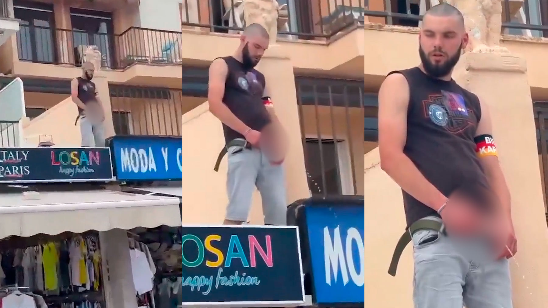 El joven, al que se le presupone estar bajo los efectos del alcohol y que lleva un brazalete con los colores de la bandera de Alemania, micciona sin ningún tipo de pudor a la calle, sobre los toldos de los locales y comercios de la primera línea de esta zona turística.