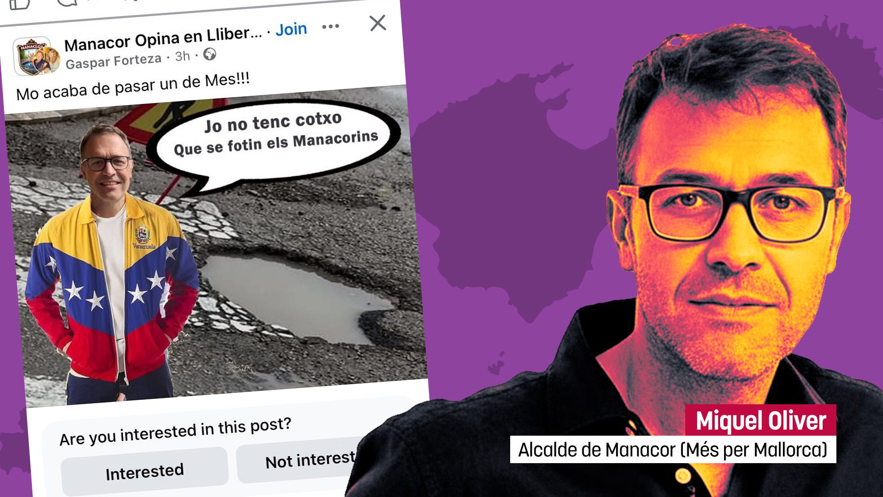 Los vecinos del municipio mallorquín de Manacor han decidido tomarse con humor la grave falta de mantenimiento de las calles del pueblo y se han mofado a base de memes de su alcalde separatista, Miquel Oliver (Més-Esquerra), al que han presentado al más puro estilo Nicolás Maduro.