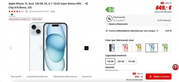 El iPhone 15, con su espectacular cámara principal de 48 Mpx y su pantalla Super Retina XDR de 6,1 pulgadas, lo puedes encontrar en MediaMarkt por 649 euros.