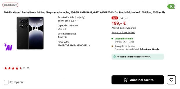 El Xiaomi Redmi Note 14 de 256 GB es otra de las gangas en este Black Friday 2025. Su precio ha pasado de 299 euros a 179,90 euros con motivo de este día.