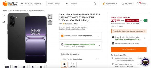 El smartphone OnePlus de 256 GB está en el mercado por 279 euros durante el Black Friday 2025. Su precio antes de esta semana era de 399 euros, lo que supone un 30% de descuento.