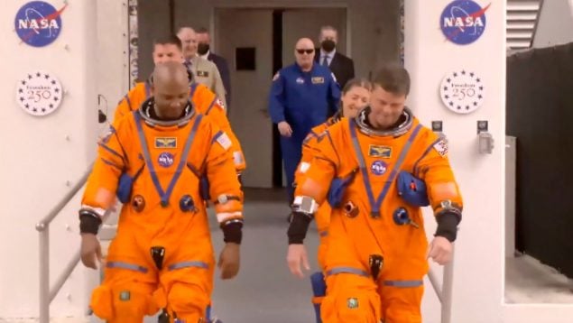 The Artemis II astronauts, now suited up for launch, are headed to the launch pad.