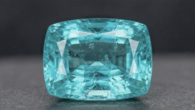 Tras un proceso posterior de recorte y ajuste, el peso final quedó en 181,61 quilates, con una talla en forma de cojín diseñada para mejorar la dispersión de la luz y la uniformidad visual. El resultado fue una turmalina Paraíba de proporciones más equilibradas y mayor transparencia.