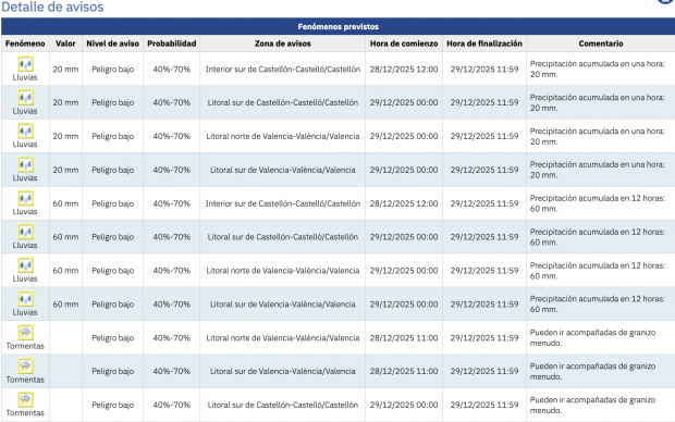 Actualizaciones en https://t.co/R3Fs2JzKgr pic.twitter.com/JmwozICpKv— AEMET Comunitat Valenciana (@AEMET_CValencia) December 28, 2025