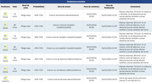 El viento seguirá siendo protagonista en la Comunidad Valenciana durante las primeras horas del lunes después de un fin de semana marcado por los avisos y fuertes rachas en el Mediterráneo. La AEMET ha activado la alerta amarilla hasta las 12.59 horas por rachas máximas de 70 km/h y 80 km/h en todo el interior de Castellón y Valencia e interior norte de la provincia de Alicante. También se activó un aviso en la zona costera del litoral norte de Alicante hasta las 04.59 horas de la madrugada del domingo al lunes.