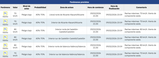 «Rachas del noroeste muy fuertes de madrugada en el interior de Castellón». Así ha avisado la AEMET de los fenómenos previstos en la Comunidad Valenciana para este lunes 9 de febrero. La predicción del tiempo es la siguiente: