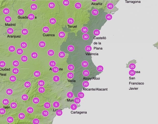 Este lunes 9 de febrero también esperan precipitaciones dispersas, especialmente en el tercio sur en las últimas horas del día. Durante esta jornada también se esperan lluvias en el litoral norte de Alicante. La probabilidad de que llueva en Castellón en la última hora del día está entre el 45% y el 70% en el interior norte de esta zona de la Comunidad Valenciana.