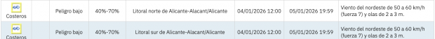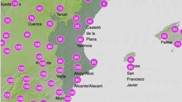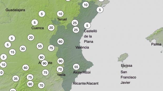 La Agencia Estatal de Meteorología también ha decretado la alerta amarilla por viento y olas de 2 a 3 metros en todo el litoral de la provincia de Alicante. Por lo que respecta a las lluvias, se espera un día con precipitaciones en todos los puntos de la Comunidad Valenciana, principalmente en la zona sur del Mediterráneo.
