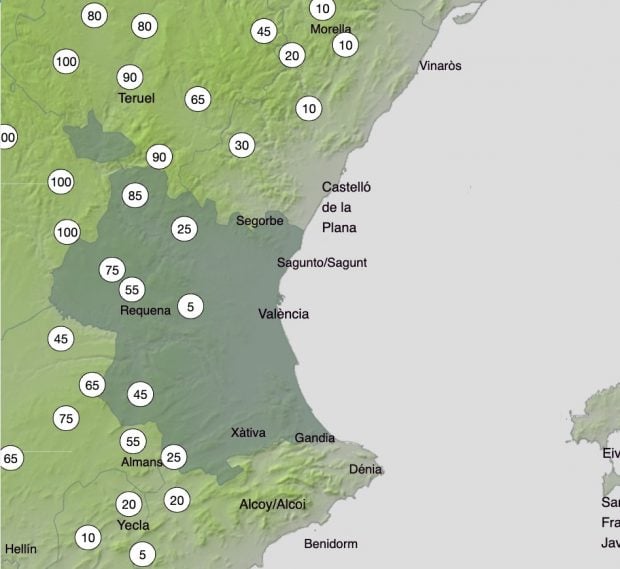 Durante las primeras horas del día, la probabilidad aumenta hasta el 65% en el interior norte de la provincia de Castellón y a últimas horas del día llegarán a ser del 85% en el interior norte de la provincia de Valencia. En Utiel, el porcentaje de que nieve durante la madrugada será del 75%. En esta zona la AEMET no descarta «precipitaciones débiles y dispersas al final del día». «Temperaturas con pocos cambios. Viento del oeste, con rachas muy fuertes en el interior, tendiendo a amainar en general durante la tarde», confirma sobre el tiempo en Valencia.