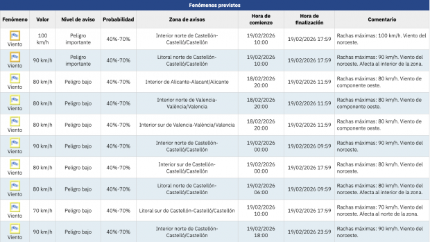 La Comunidad Valenciana vuelve a estar en alerta por viento y la AEMET ha elevado el aviso a nivel naranja por las rachas máximas de 100 km/h que se esperan entre las 10.00 horas y las 17.59 horas en el interior norte de la provincia de Castellón. En el litoral norte, el peligro importante es por rachas de 90 km/h de viento noroeste. También estarán en alerta amarilla todo el interior de la Comunidad Valenciana y toda la provincia de Castellón. Así, la AEMET ha decretado la alerta amarilla por rachas máximas de 80 km/h a primera hora de la mañana en el interior de Alicante y Valencia.