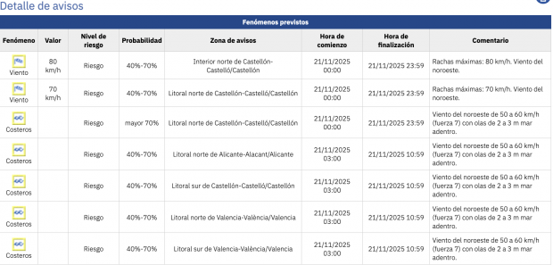 La AEMET ha decretado la alerta amarilla por «rachas muy fuertes de viento» en la Comunidad Valenciana para este viernes 21 de noviembre. Esto sucederá especialmente en la provincia de Castellón, donde se esperan rachas de hasta 80 km/h en el interior norte y de 70 km/h en el litoral norte. En esta zona también se espera un viento del noroeste de 50 a 60 km/h con olas de 2 a 3 metros mar adentro.