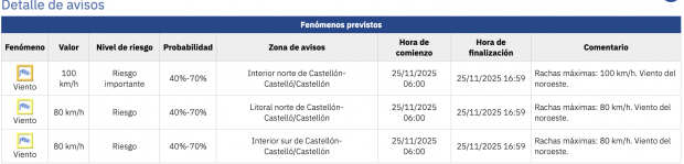La Comunidad Valenciana sigue en alerta máxima por viento. La AEMET decretó para el lunes 24 de noviembre la alerta amarilla en las provincias de Alicante, Valencia y Castellón, y para este martes 25 la Agencia Estatal de Meteorología ha subido la alerta a naranja en esta última provincia. Concretamente, avisa de un «riesgo importante» por el viento en el interior norte de la provincia de Castellón. En el interior sur y el litoral se ha decretado la alerta amarilla.