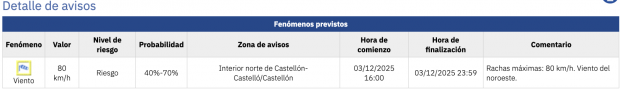 La Comunidad Valenciana vuelve a estar en alerta por viento. Después de una última semana de viento en la que predominaron las fuertes rachas de viento en la zona costera de la comunidad, para este miércoles 3 de diciembre la AEMET ha decretado la alerta amarilla por rachas máximas de hasta 80 km/h con viento del noroeste. «Temperaturas mínimas con pocos cambios y heladas débiles en puntos aislados del interior; máximas en descenso», ha informado la Agencia Estatal de Meteorología sobre las temperaturas en la provincia de Castellón, que caerán hasta los 0 ºC en Morella y a 6 ºC en Castellón de la Plana.
