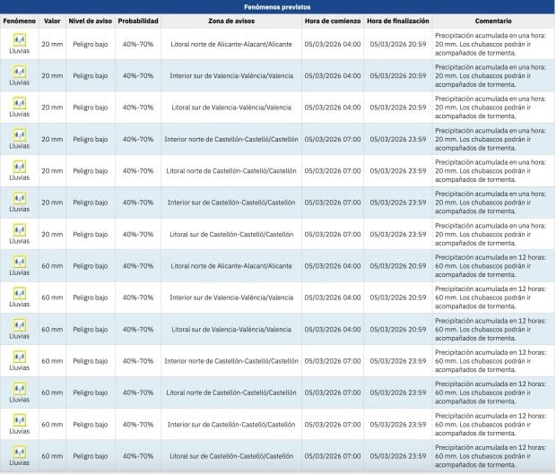 La predicción del tiempo de la AEMET para este jueves 5 de marzo en la Comunidad Valenciana es la siguiente:
