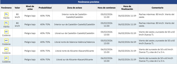 La borrasca Leonardo sigue presente en la Comunidad Valenciana en forma de viento y lluvias. Por ello, la AEMET mantiene la alerta amarilla por «rachas muy fuertes del oeste en los interiores de Castellón y Valencia». Este aviso se ha activado hasta las 12.00 horas de este viernes 6 de febrero y se esperan «rachas máximas: 80 km/h de viento del oeste». A partir de las 15.00 horas y hasta las 22.00 horas, se ha activado otro aviso en el litoral de Alicante por «viento del suroeste de 50 a 60 km/h (fuerza 7) y olas de 2 a 3 metros».