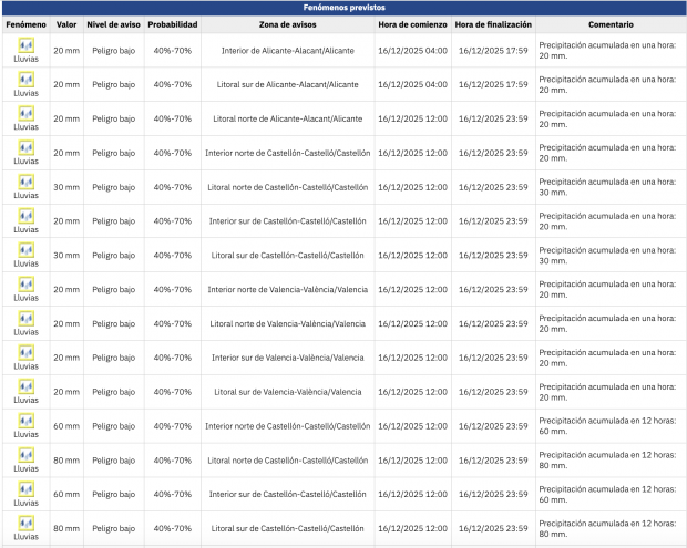 La predicción del tiempo en la Comunidad Valenciana de la AEMET para este martes 16 de diciembre es la siguiente:
