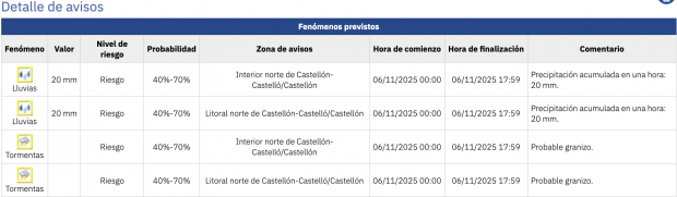 «Precipitaciones localmente fuertes y acompañadas de tormenta en el norte de Castellón. No se descartan rachas muy fuertes del noroeste en el norte de Castellón a últimas horas», ha informado la AEMET sobre lo que puede ocurrir en el norte de Castellón hasta las 17.59 horas de este jueves 6 de noviembre. La precipitación acumulada en una hora que se espera en el interior norte y litoral norte es de 20 mm con una probabilidad de entre el 40% y el 70%. La Agencia Estatal de Meteorología también avisa de posibles episodios de granizo.