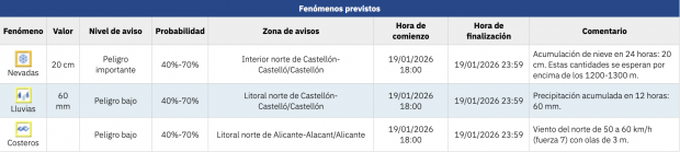 La Comunidad Valenciana se prepara para un día de fenómenos atmosféricos adversos en este lunes 19 de enero. La AEMET ha decretado hasta tres alertas, una naranja y dos amarillas, en las provincias de Castellón y Alicante. La primera será por nieve y ha sido activada en el interior norte de la Comunidad Valenciana, donde se espera una «acumulación de nieve en 24 horas de 20 centímetros». «Estas cantidades se esperan por encima de los 1200-1300 m», informa la AEMET.
