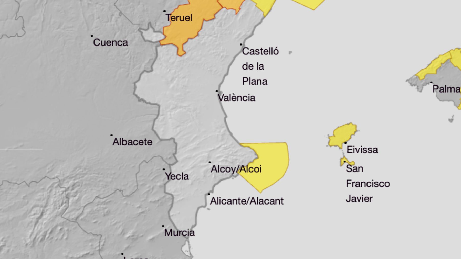 La Agencia Estatal de Meteorología también ha activado una alerta amarilla por lluvias en el litoral norte de Castellón que comenzará a las 18.00 horas de este lunes 19 de diciembre. En esta zona de la Comunidad Valenciana se espera una precipitación acumulada de 60 milímetros en 12 horas. «Probables chubascos aislados en puntos del litoral por la mañana y precipitaciones generalizadas avanzando de norte a sur por la tarde, con probabilidad de que sean localmente fuertes o persistentes en el norte», dice la AEMET sobre el tiempo en esta zona.